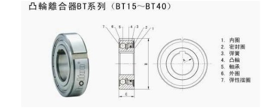 1. BT系列凸轮离合器中每种规格含三种类型:无键型、内键型、内外键型,分别用BT(X),BT(X)-1K和BT(X)-2K表示,其中BT(X)-1K键槽尺寸与相应的BT(X)-2K内键槽尺寸相同。