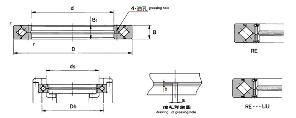 " 注)•附带密封垫片的公称型号是RE•••UU. Code of sealed type is RE•••UU. •在要求高精度时,请使用外圈旋转的方式。 Please use outer ring rotary when high precision is required." |