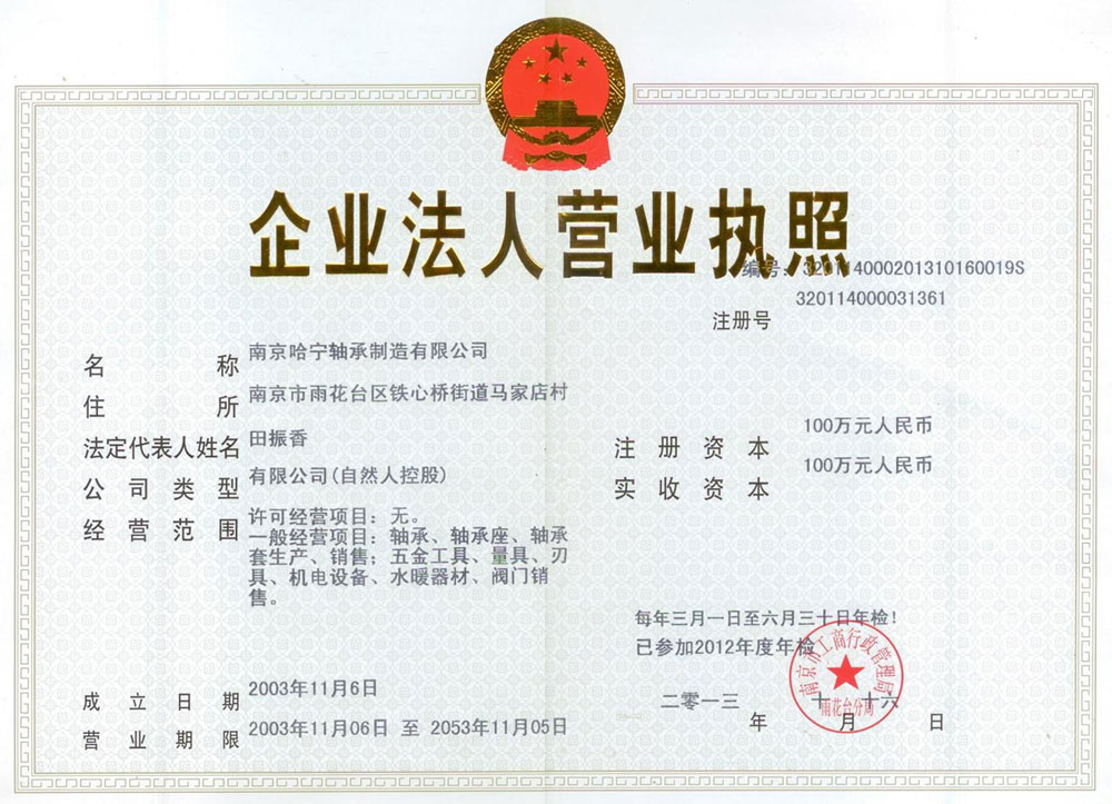 企业法人营业执照-南京哈宁轴承制造有限公司