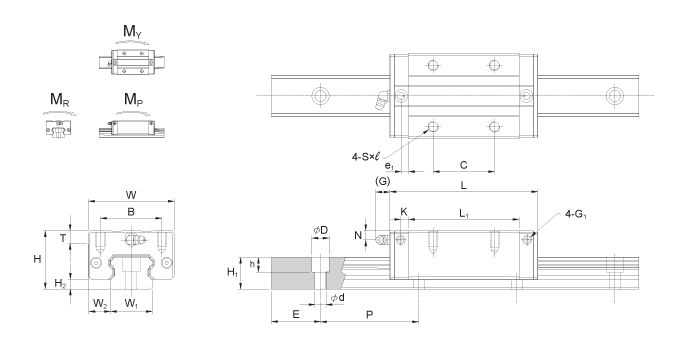 型號 滑軌尺寸 基本定格荷重 靜容許力矩 質量