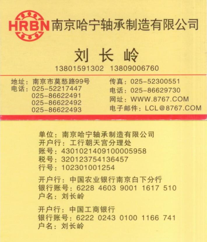 单位汇款资料:南京哈宁轴承制造有限公司 开户行及帐号:工行朝天宫分理处4301021409100005958