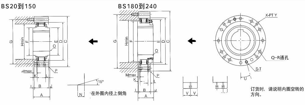 1)确认凸轮离合器的旋转方向。在内圈上的箭头表示的是内圈自由转动的方向(凸轮脱开的方向)。请确定凸轮啮合的方向符合预定方向。